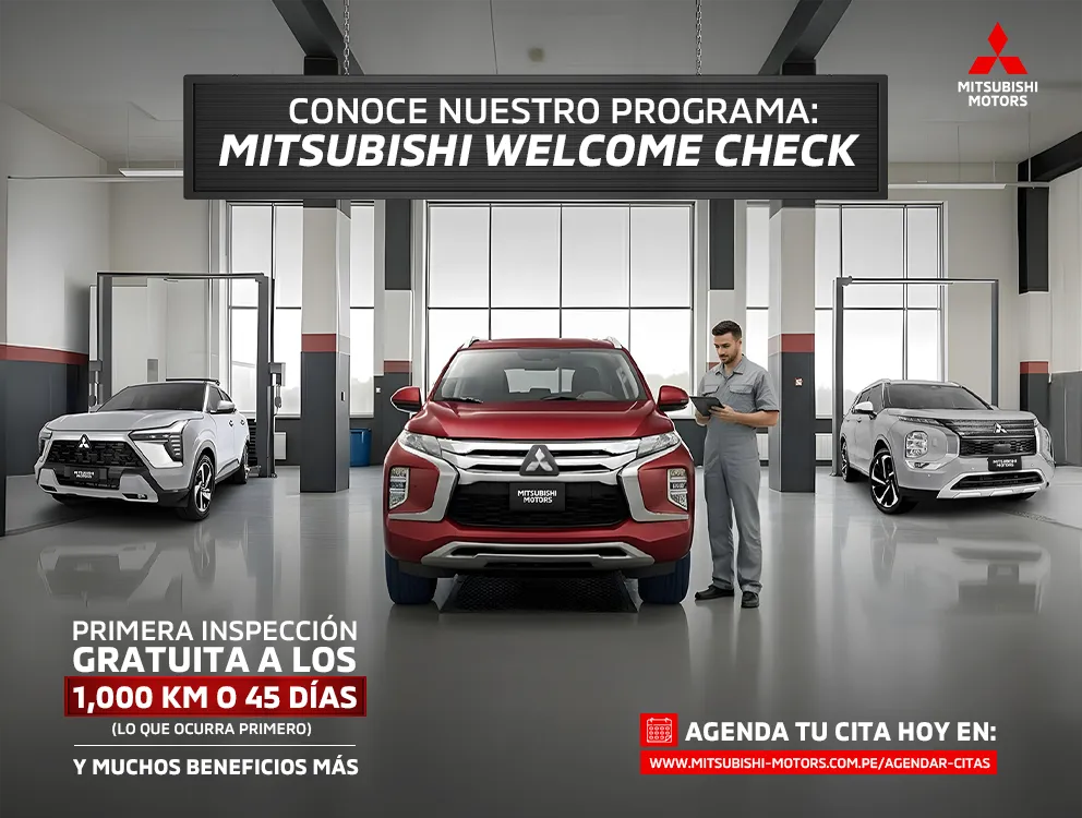 Nuestro Programa "Mitsubishi Welcome Check" te permitirá conocer tu Mitsubishi para que lo disfrutes al 100%! Visita tu taller oficial de preferencia para realizar tu inspección gratuita de 1,000 km ó 45 días (lo que ocurra primero) y conoce lo que tenemos para ti